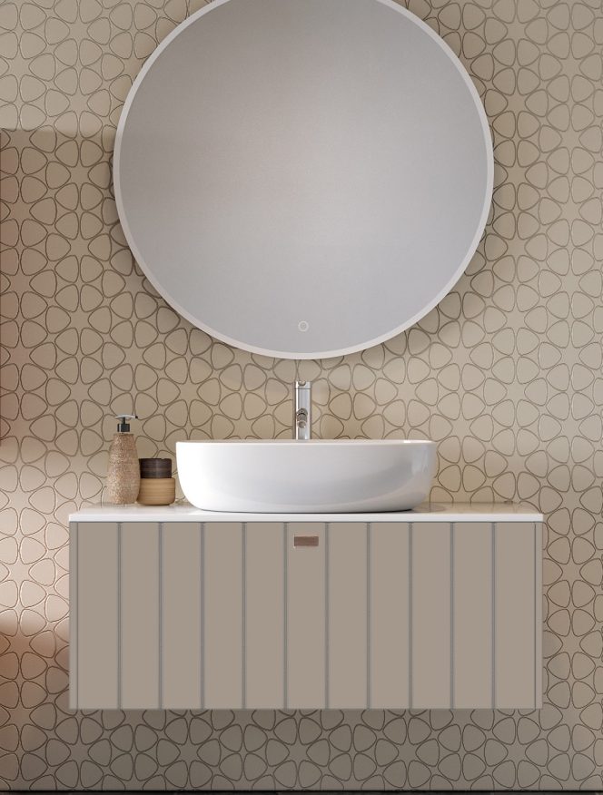 Eelkomplekteeritud freesitud triibulise fassaadiga vannitoamööbel laia mõõdu- ja värvitud viimistlusvalikuga -