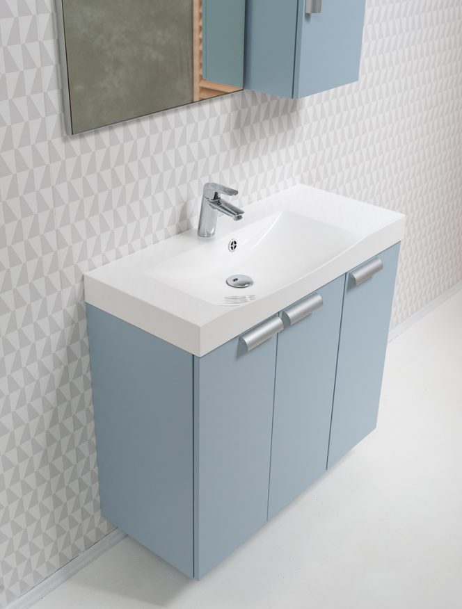 Funktsionaalne Skandinaavia stiilis eelkomplekteeritud vannitoamööbel värvitud viimistluses -