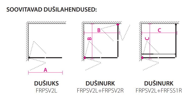 Saadaval kahe erineva raamimotiiviga – R1 ja R2 –, standardlaiuses (üksik uks 87 cm, dušinurga välismõõt 90 × 90 cm) ning erilaiuses vastavalt vajadusele.