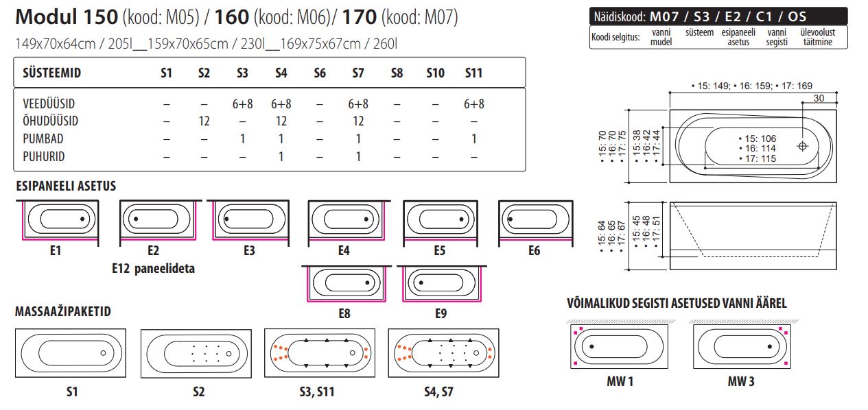 Modul 150/160/170/180 vannile pakume ka erinevaid dušiseinasid: pendel-dušisein (VS1); voldik-dušisein (VS2); fikseeritud dušiseinad (VS3; VS4; VS5). Kõik dušiseinad on valmistatud vastupidavast 6 mm karastatud klaasist ja sobivad täienduseks sirgjoonelistele akrüülvannidele. Valikut vaata seotud failide alt.