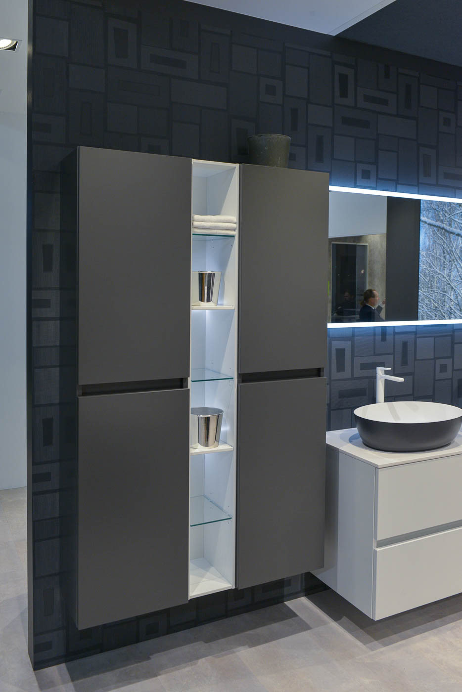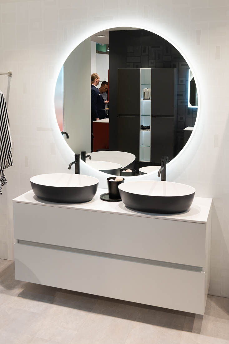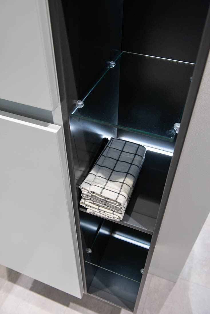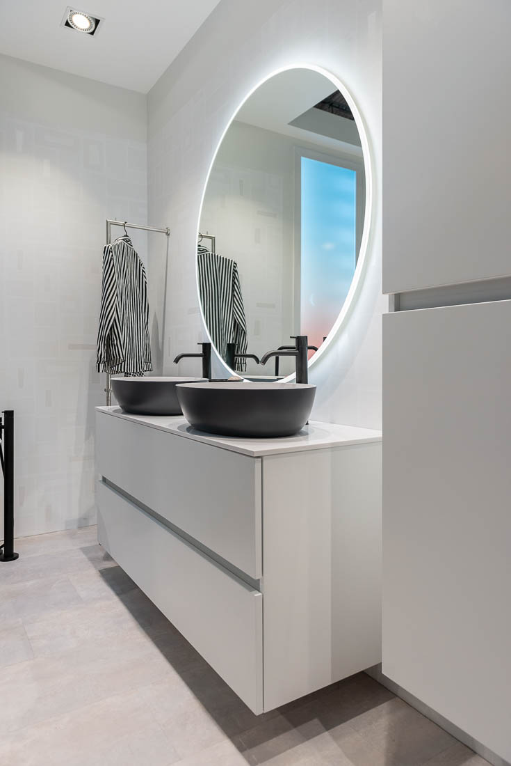 Balteco Flo vannitoamööbel modernse disaini ja Skandinaavia värvitoonidega, 45° korpused, BLUM Tandembox ja Xonyx lettvalamu.