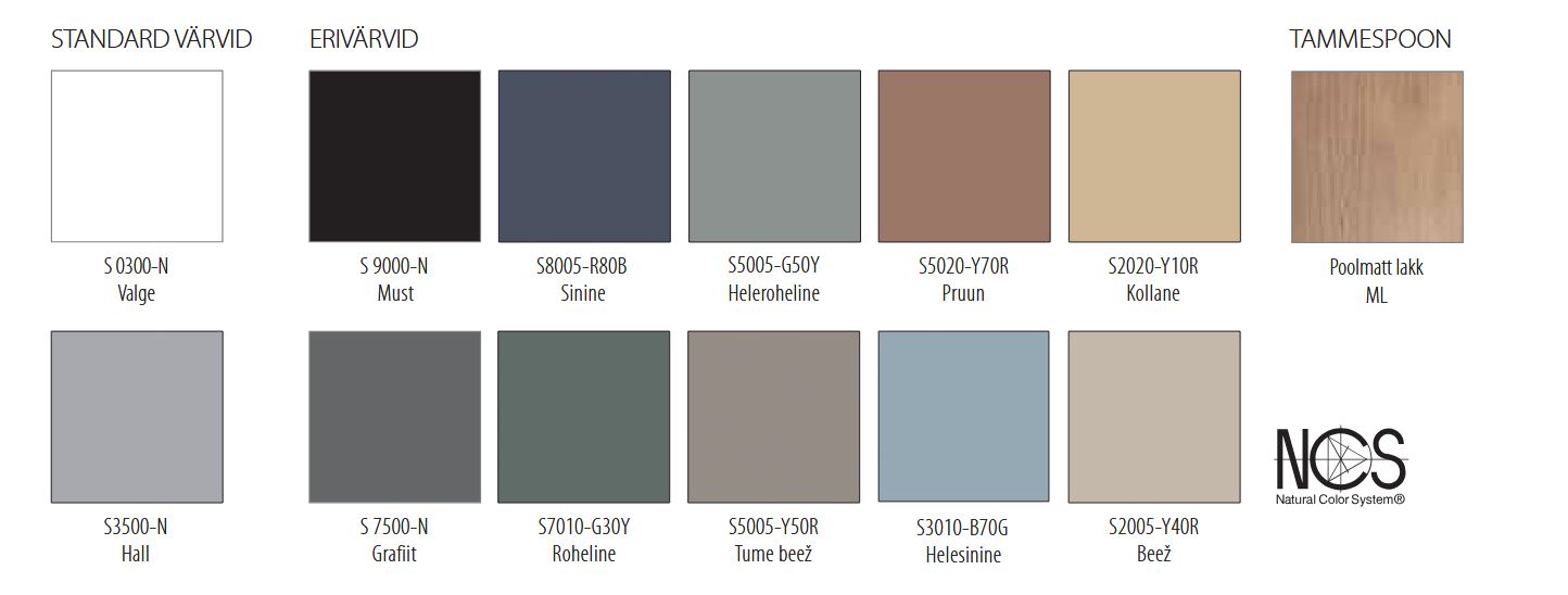 Valikus on rahulikud ja ajatud toonid, mis loovad vannituppa puhta ja põhjamaise ilme. Standard värvid on Valge S 0300N ja Hall S3500-N. Valikus on ka Tammespoon viimistlus.