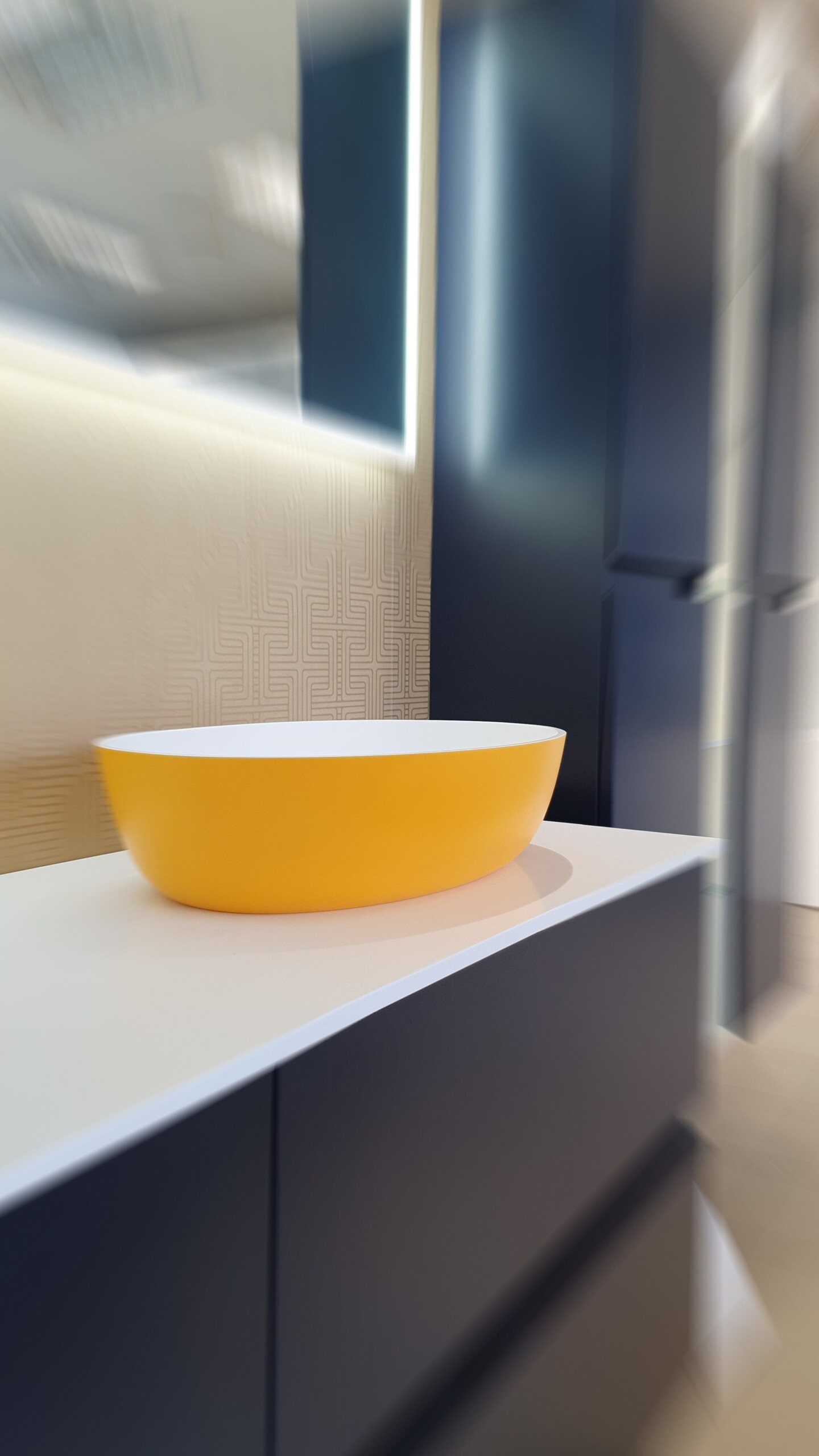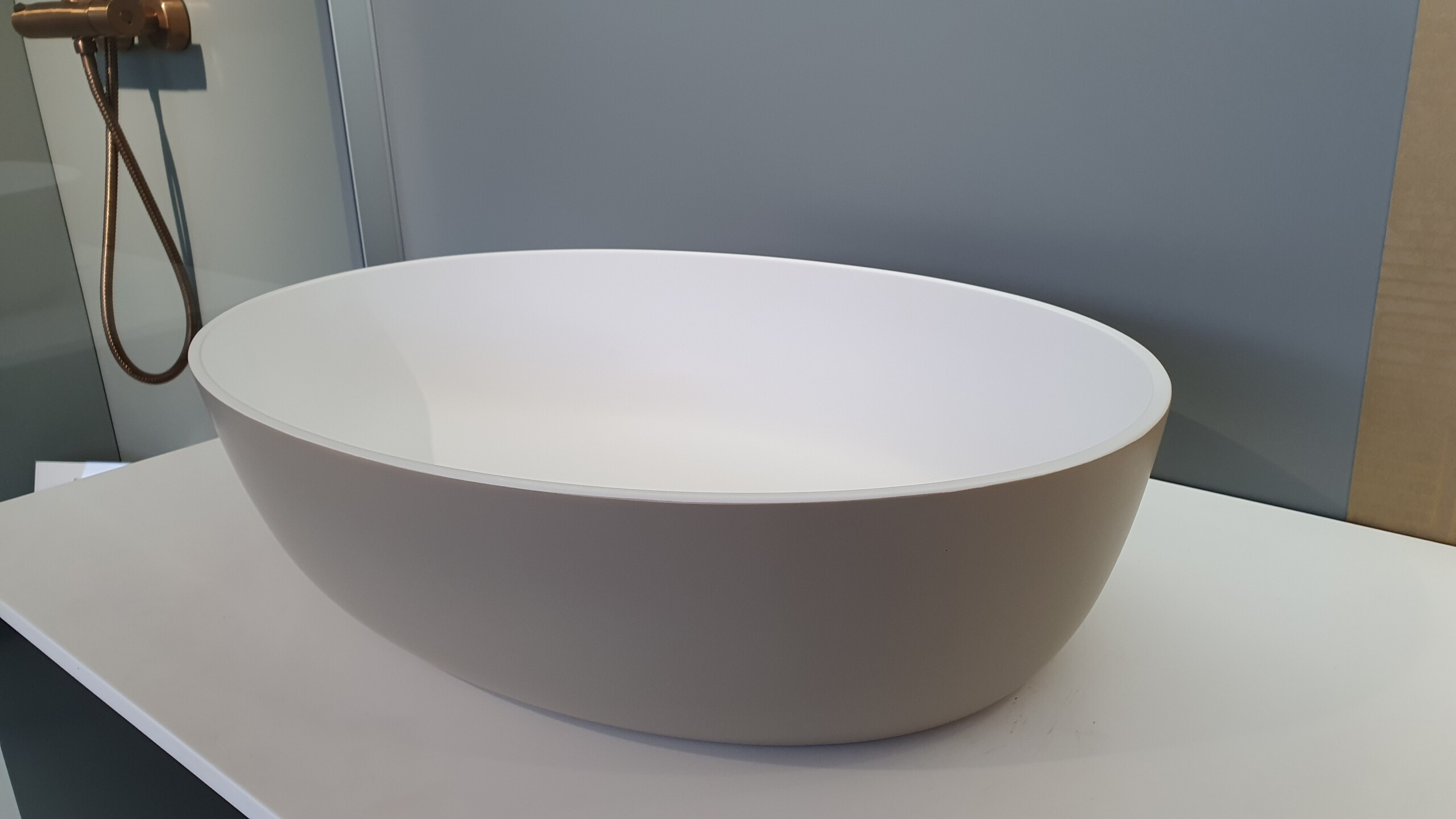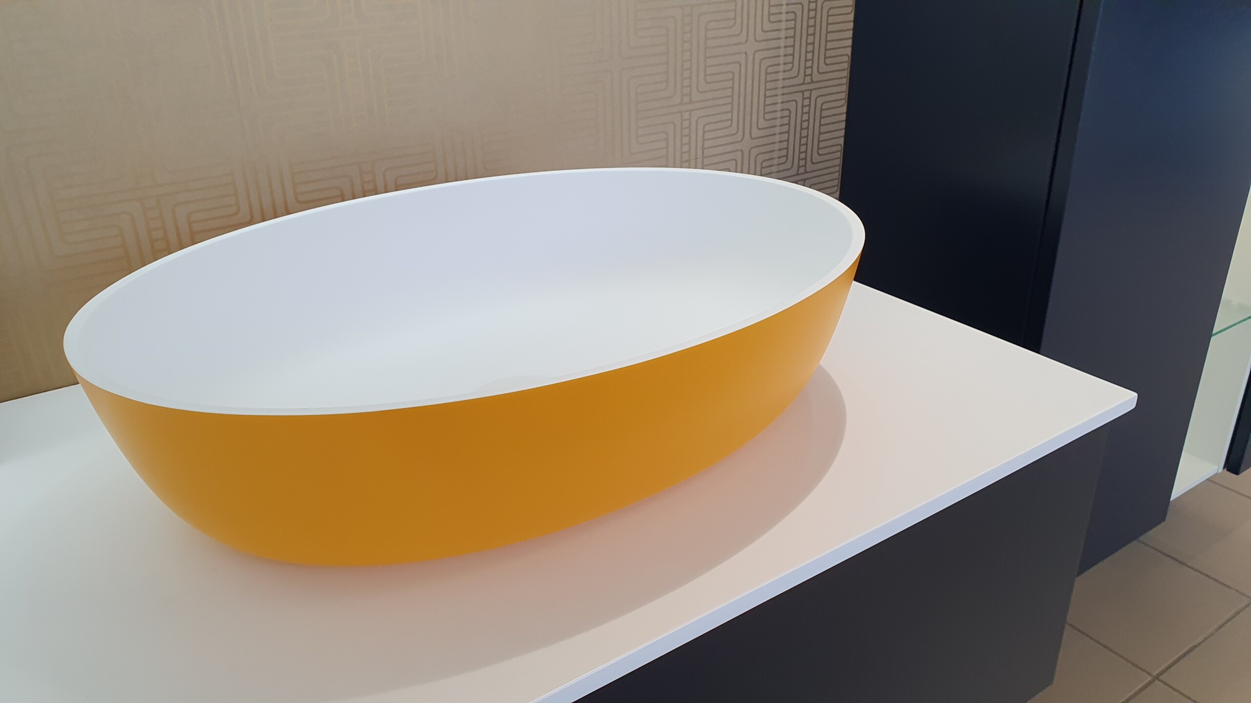 Minimalist elliptical Xonyx™ solid surface stone basin. Durable with a silky matte finish, this basin suits both modern and classic interiors. The exterior finish can be ordered according to the RAL colour code – create a colour solution that fits your space perfectly.
