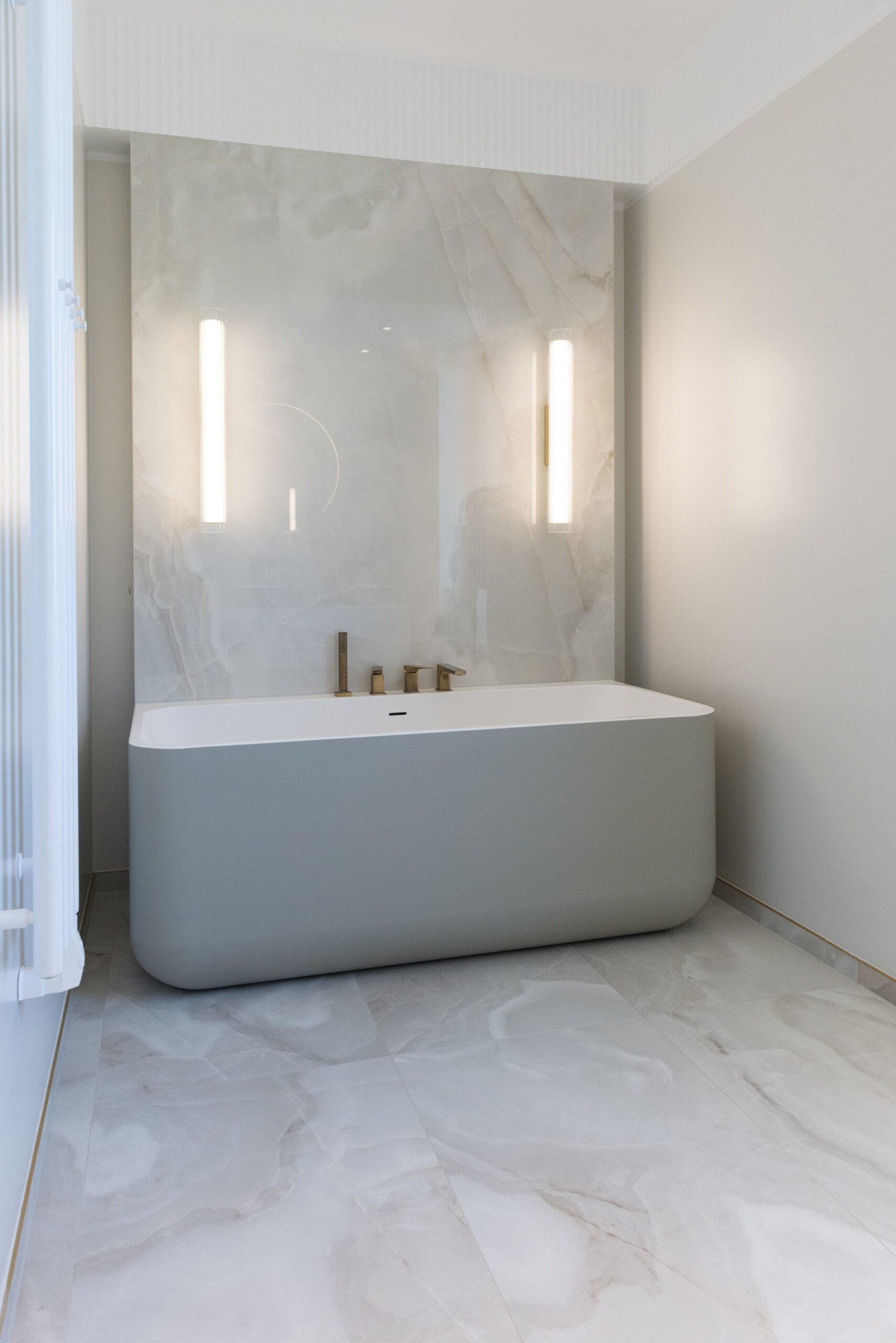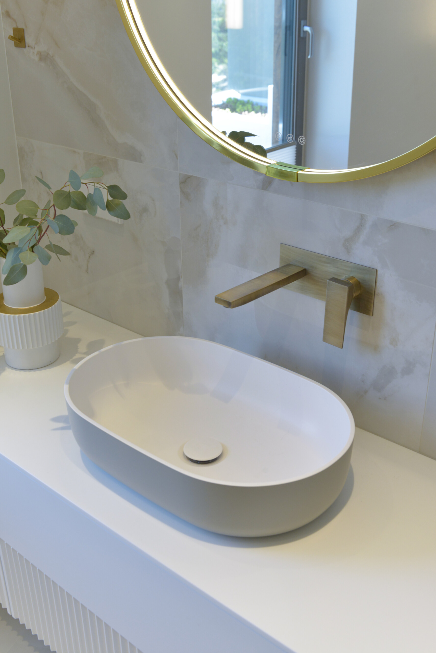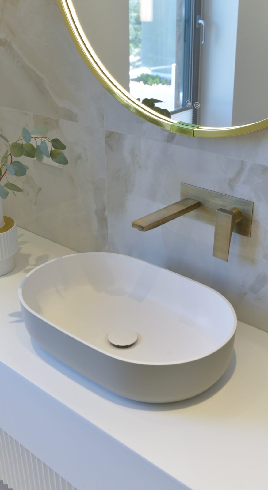 The bathroom of this modern home is designed with Balteco’s elegant Neo-series basins, with the Gamma 160 Xonyx solid surface bathtub serving as the central design element. The space is defined by minimalist elegance, thoughtful functionality, and a calm, harmonious colour palette. The Neo basin, with its soft grey finish and golden accents, adds a luxurious touch that blends beautifully with the light pastel tones. At the heart of the room, the Gamma 160 bathtub stands out with its luminous, sculptural form and smooth finish – transforming the bathroom into a serene and beautiful retreat.