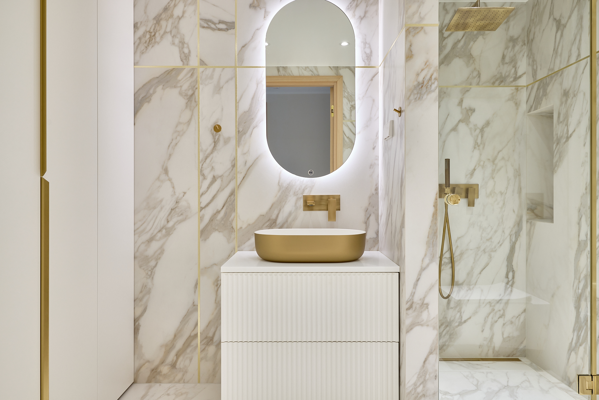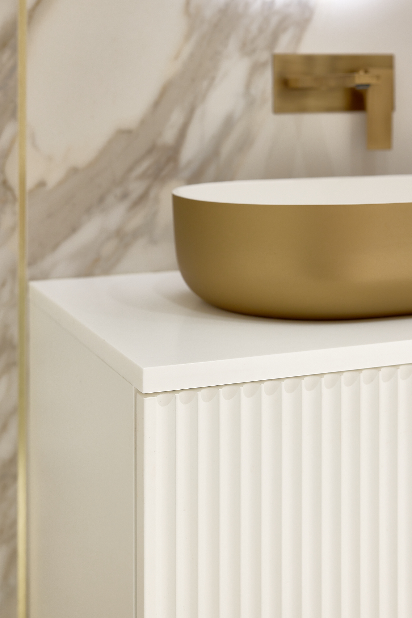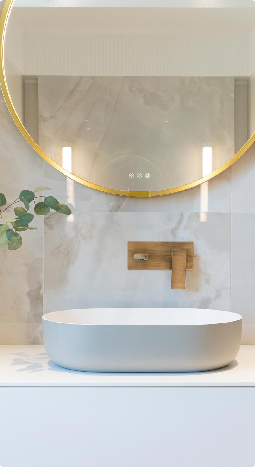 The bathroom of this modern home is designed with Balteco’s elegant Neo-series basins, with the Gamma 160 Xonyx solid surface bathtub serving as the central design element. The space is defined by minimalist elegance, thoughtful functionality, and a calm, harmonious colour palette. The Neo basin, with its soft grey finish and golden accents, adds a luxurious touch that blends beautifully with the light pastel tones. At the heart of the room, the Gamma 160 bathtub stands out with its luminous, sculptural form and smooth finish – transforming the bathroom into a serene and beautiful retreat.